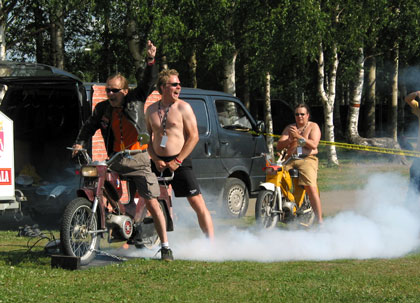 Iltaa kuomat! Moposhow vetäistiin rapia tunti sitten Linnunlahden uimarannalla. Väkeä oli älyttömästi ja mopoaiheinen musiikki sekä ääliömäiset stunttitemput toimivat kuin nippuside vanhassa kaksitahtisessa.