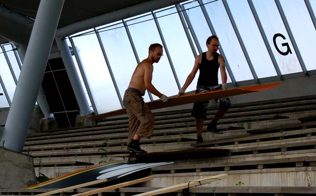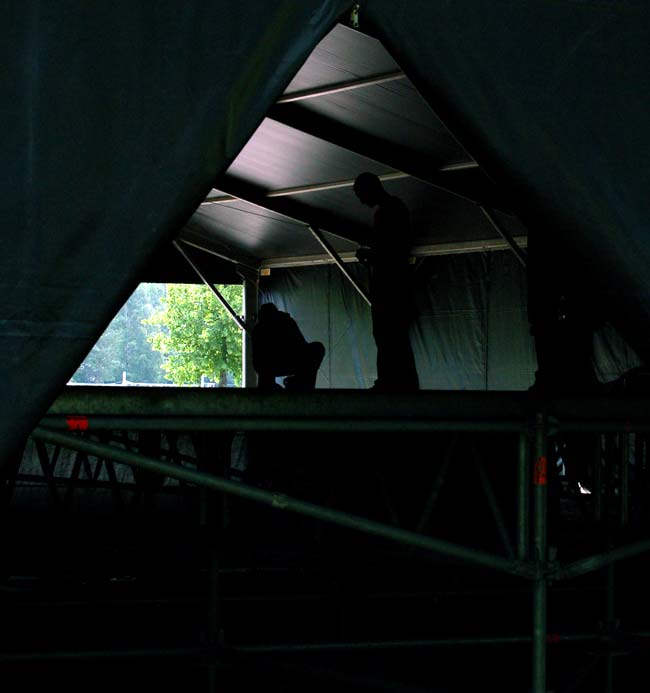 ...Mutta sisällä rakennetaan esiintymislavaa pimeydessä.