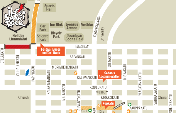 The festival bus service ("Rokki" buses) runs all weekend between the Joensuu railway station and the festival site Laulurinne after the arrival of each train. On Sunday you can take the Rokki bus back to the railway station. On Friday and Saturday the buses will also stop at the school accommodation on their way to Laulurinne.