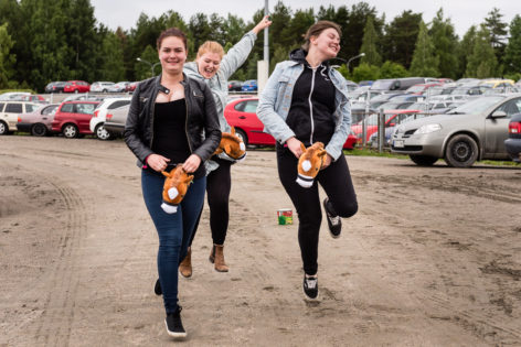 Janika Hyvärinen (vas.), Anna Lahtinen ja Minna Huovinen osallistuivat keppihevosraveihin. Kuva: Markus Korpi-Hallila