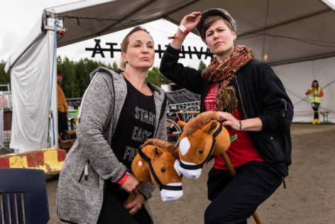 Ihmisten innostaja Margareetta Räty (vas.) ja raviemäntä Kaisu Halonen kannustivat osallistumaan keppihevosraveihin. Halonen toimii rokissa myös Lounge-teltan hostina, Räty kaverijumpan ohjaajana. Kuva: Markus Korpi-Hallila