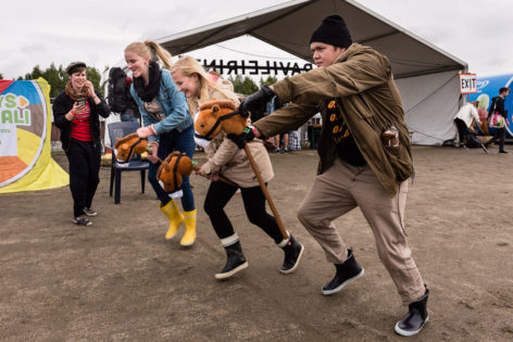 Nopeus ei ratkaise, vaan myös hevosmiestaidot mitataan. Näin ohjeistaa raviemäntä Kaisu Halonen keppihevosskabaan osallistujia Ravileirinnän portin pielessä lauantaina puolilta päivin. Ideana on kerätä kolme ratsastajaa lähtöviivalle ja ravata keppareilla peltipurkin ympäri.