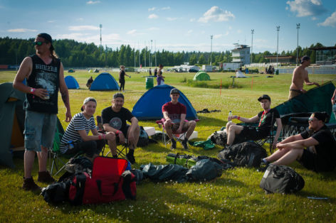 Ravileirinnän auetessa torstaina klo 18 portilla on reilusti jonoa. Ensimmäisen keikan alkuun on vielä tasan 23 tuntia, mutta ensimmäisillä festarivierailla on jo täysi tohina päällä. Yksi ensimmäisistä raviradalla telttojansa pystyyn kiskovista ryhmistä on yhdeksänhenkinen joensuulaislähtöinen seurue.