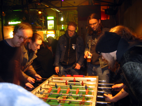 Soundcheck oli hankala, meillä kun ei ollut mukana kuin omat soittimet, pari piuhaa ja pedalit. Vahvistimet ja äänentoisto oli baarin tai paikallisten bändien, ja laitteistoihin tutustuminen oli hämmentävää, vaikka kamat lopulta osoittautuivatkin varsin kelvollisiksi. Ja itse baari oli mahtava, helvetin miellyttävän oloinen tila. Paitsi takahuone, joka oli kooltaan jotain postimerkin luokkaa. Sinne sisään mennessä oli vähän sama fiilis kuin yrittäisi mahduttaa kiveksiäkin kondomiin sen kaksinkerroin menevän velton peniksen seuraksi. Oletteko muuten ikinä kokeilleet? Mahtava tunne.