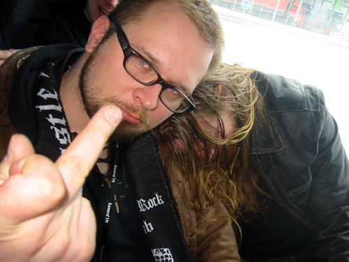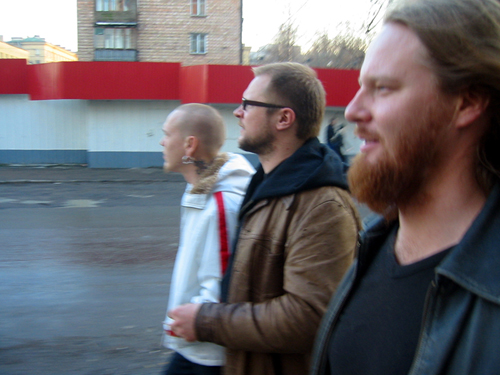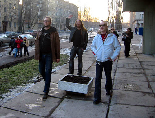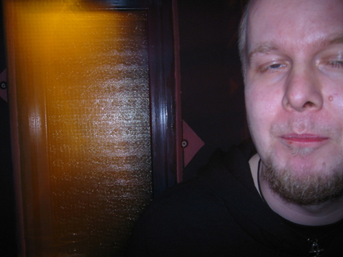 Tapasimme muutaman minuutin kuluttua. Seurueeseen liittyi takavasemmalta myös Mokoman edustaja Kuisma Aallon muodossa (olikohan Hyrkäskin paikalla, ei voi muistaa?). Kun tähän lisätään vielä se fakta, että Kotiteollisuus oli tätä ennen käynyt palaverissa joensuulaisen dokumenttiryhmän pakeilla, ja jotain oltiin illan aikana jo kuvattukin, alkoi ilmassa todellakin leijua rikin katku. Kotiteollisuuden poikien Pietarin reissu oli nimittäin päätetty dokumentoida oikein filmille. Sehän tarkoittaa sitä, että meidän täytyy esittää niitä vitun idiootteja, joita meidän odotetaan olevan heti alusta saakka. Eli täysi känni päälle ja paska housuun. Ja vähän hitaasti.