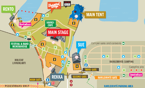 You can change your ticket for a wristband on Friday and Saturday at ticket change points next to ice rink. Ticket change points are open on Friday from 3pm to 11pm and on Saturday from 11am to 7pm. After that ticket change point is located at the Main gate from 7pm to 11pm and on Sunday from 12 noon to 10pm. There are also ticket change points at Ravilerintä and Niittyleirintä camping sites.