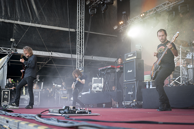 Opeth starts their gig on the Main Stage exactly at 20:15. This Swedish metal band has gathered a surprisingly small crowd, which has been spread out. Quite a few people are sitting on the grass and enjoying the weather, cooled off by the evening.