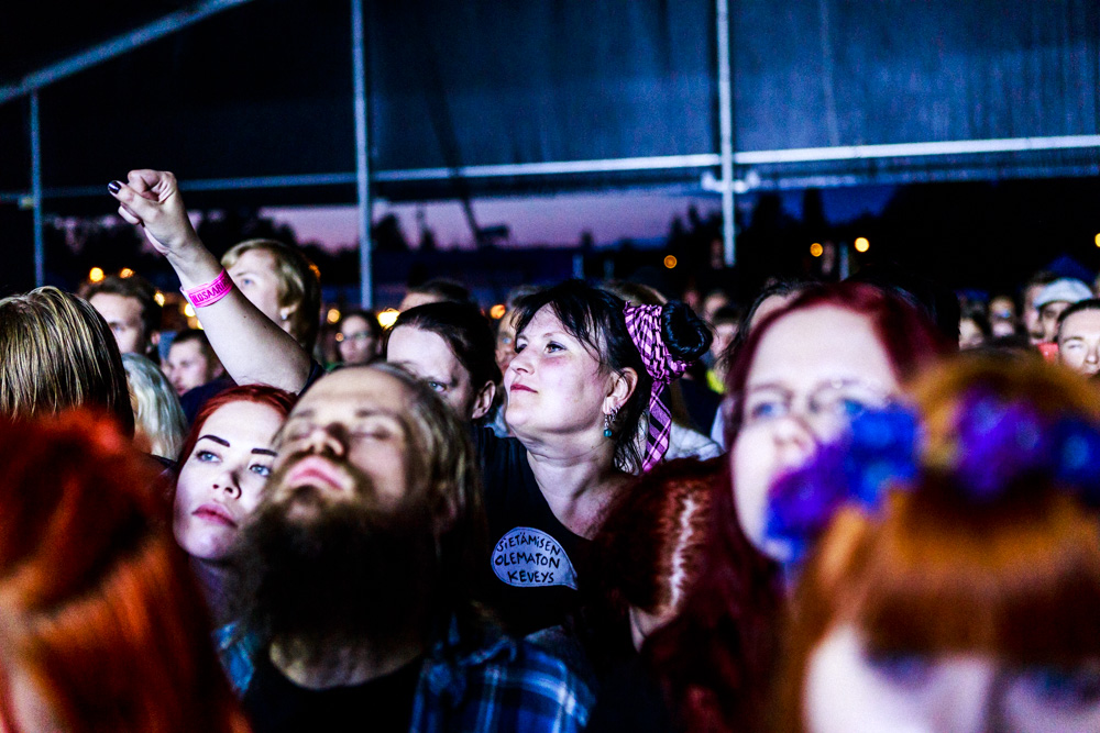 Perjantain Töminä-klubin päätti tunnelmaan sopivasti helsinkiläislähtöinen, henkiin herätetty suomalaisen goottirockin legenda Musta Paraati. Bändin historia ulottuu pidemmälle kuin keskimääräisen festarivieraan ikä, ja muutoksia vuosien varrelle on riittänyt useammankin yhtyeen tarpeisiin. Uusimmassa tulemisessa bändin alkuperäistä kokoonpanoa kitaristi Sakua, basisti Pandaa, syntetisaattoristi Kääriäistä ja rumpali Ykää täydentää solistin roolissa mittavan uran suomalaisessa rokkiskenessä itsekin tuottanut Frank Mikko Kalevi Mäntymäki, joka huomattavasti tuttavallisemmin tunnetaan yksinkertaisesti Herra Ylppönä.
