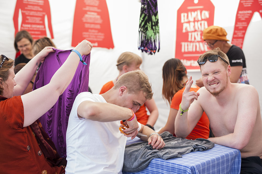 Marttojen pajalla on ruuhkaa lauantaina iltapäivällä, kun saavumme paikalle. Pöydän ääressä istuu joukko naisia ja muutama mies täydessä työn touhussa. Martat kertovatkin innoissaan, että myös miehet ovat intoutuneet tuunaamaan vanhaa uudeksi. Muutama nuori mies on jopa riisunut paidan päältään ja ehostanut vaatteen festarikuntoon.