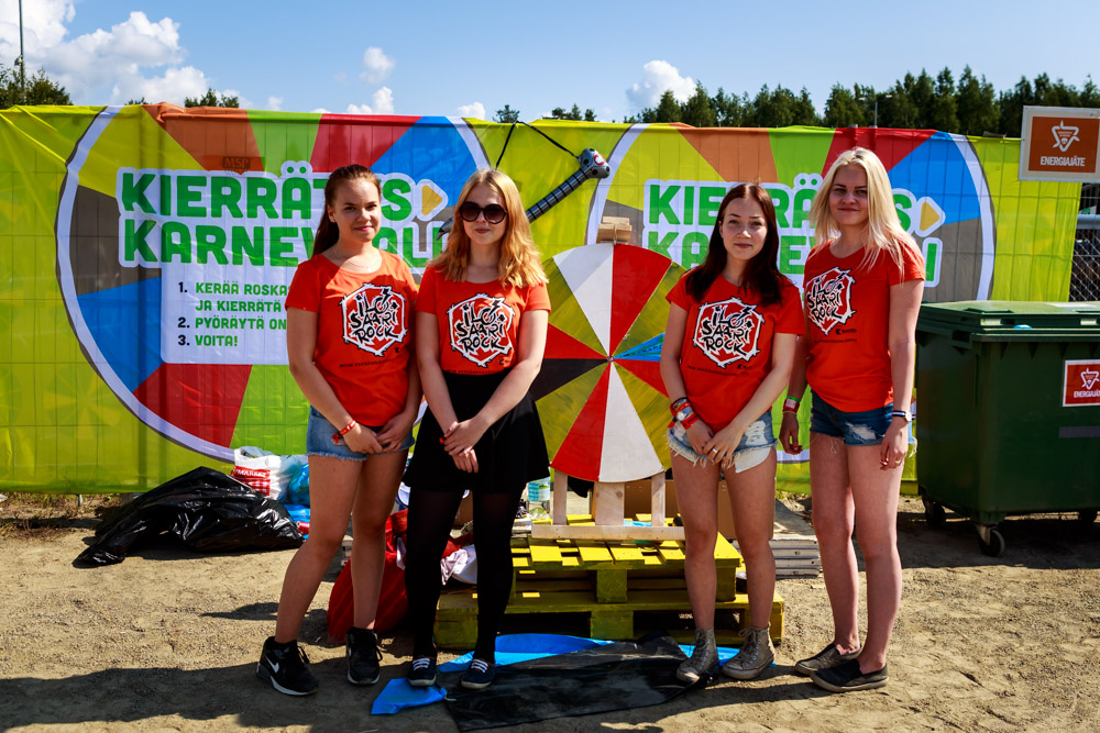 Kierrättämisestä on tehty festarivieraille helppoa ja ennen kaikkea hauskaa. Ravileirinnässä pääsee pyörittämään kierrätysonnenpyörää tuotuaan paikalle ensin pussillisen roskia ja lajittelemalla ne oikein.