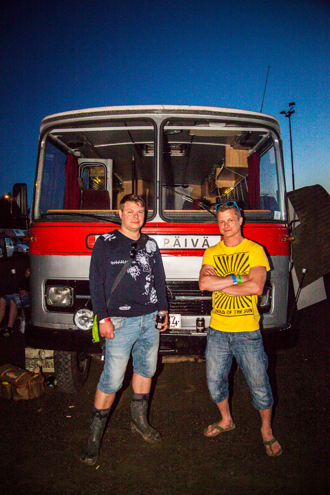 Päälavalta kaikuu Antti Tuiskun viimeinen biisi. Ravileirinnässä valmistaudutaan kuitenkin jo lauantaiyön jatkoihin. Kierrämme valokuvaaja Veera Konstin kanssa haistelemassa leirintäalueen tunnelmia, kun silmiimme osuu 1969-vuoden Mercedes-mallinen bussi. Ajopelin edessä istuskeleva mies heiluttaa kättään kutsuen verkkotoimituksen edustustoa liittymään illanviettoon.