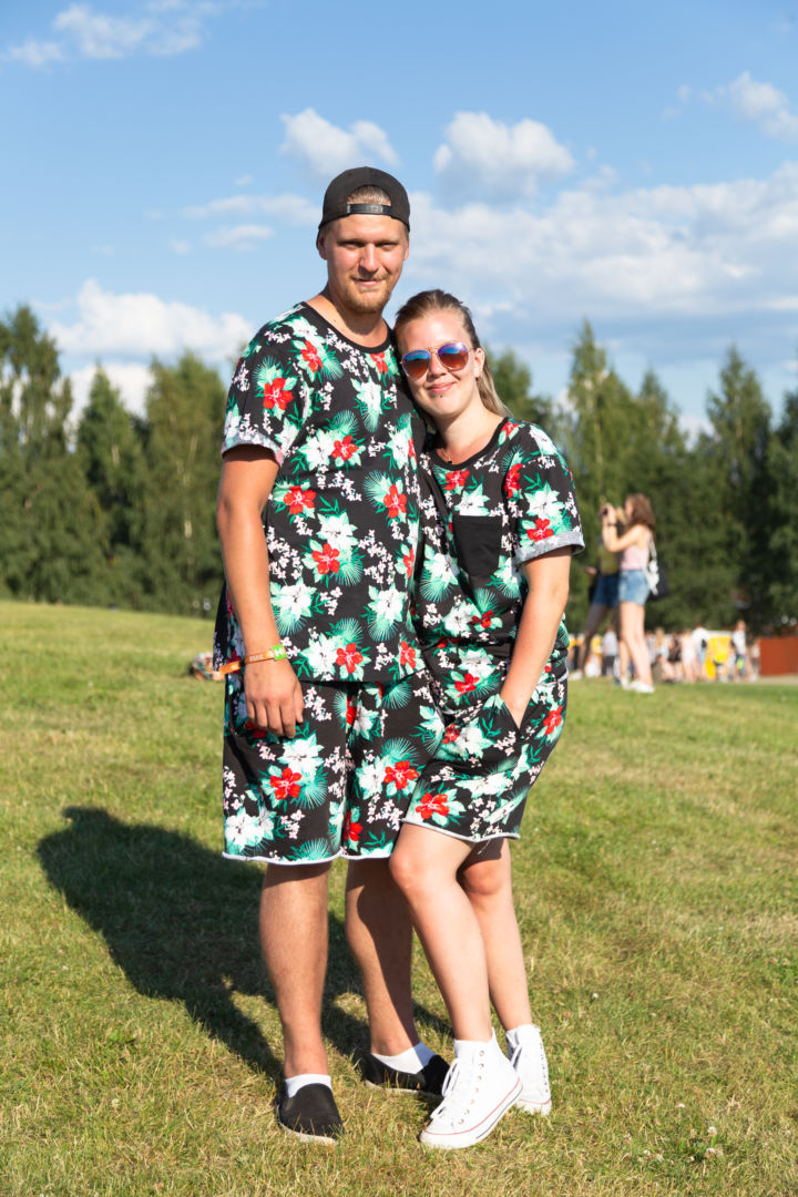 Auringonpaahteisella bongailukierroksellamme törmäämme räikeästi pukeutuneeseen helsinkiläispariskuntaan, joka kutsuu itseään nokkelasti yhteisnimellä ”Oki Mangi”. Nimen juuret ovat heidän yhdenmukaisissa hatuissaan. Yksisarvisteemalla rokkaava pariskunta viettää perjantaina sanojensa mukaan Team Unicorn -päivää. Festariasukokonaisuus on kaksikon perinne jo neljän vuoden takaa. Alun alkaen idea lähti Okin kokovartalohaalarista. T-paita taas on Mangin löytö Australiasta. Koko viikonloppurupeamaa he eivät kuitenkaan asuissaan viihdy, vaan kertovat kyseessä olevan yhden illan show.