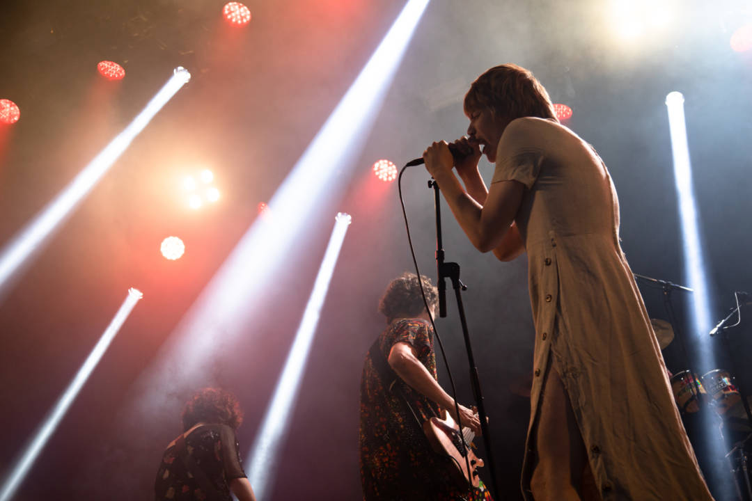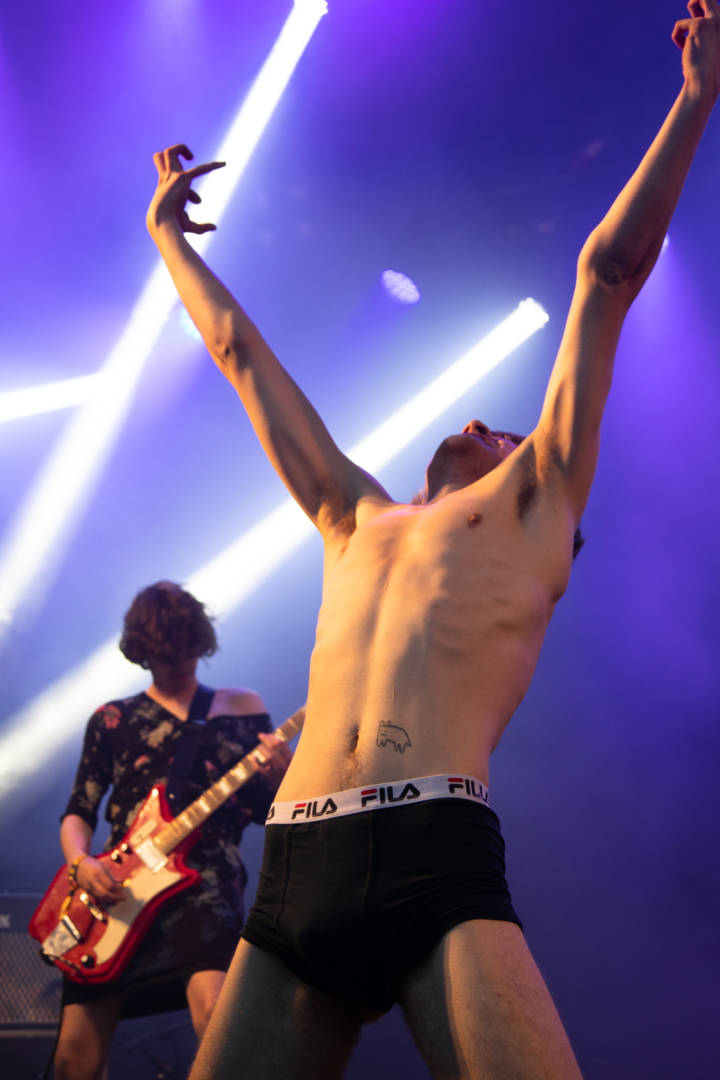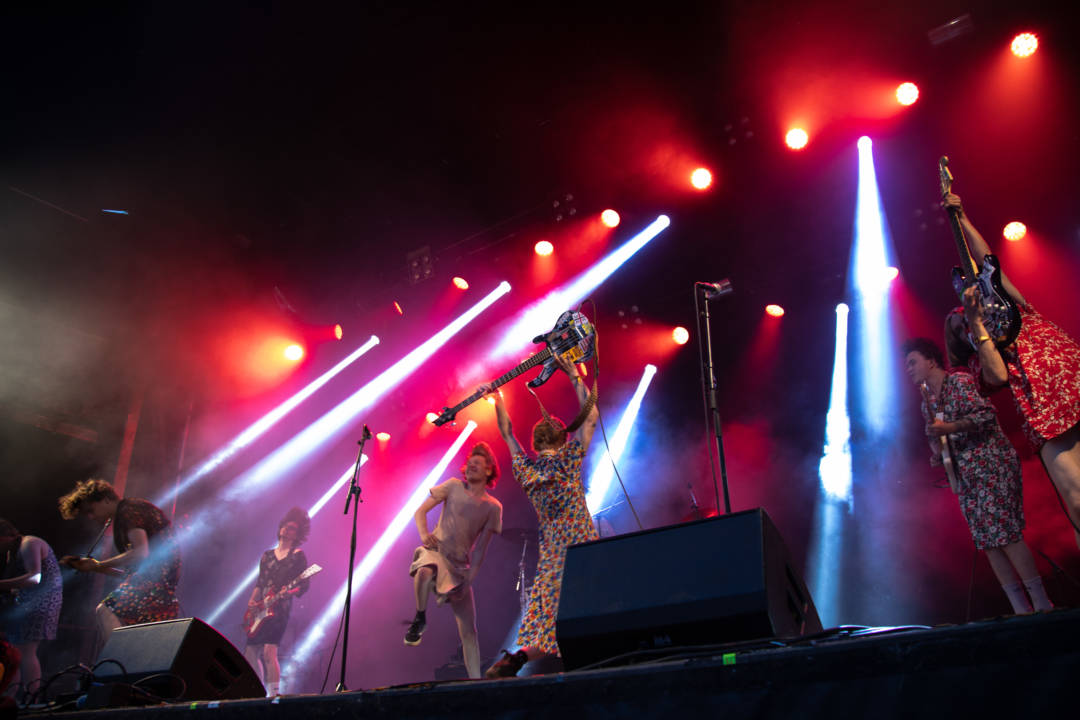 Mutta kukkamekkoihin pukeutuneet henkilöt ovatkin oletettavasti miehiä, osa on jättänyt alushousunsa kotiin. Ja perinteisen bändikokoonpanon sijaan lavalla on laulajan ja basistin lisäksi kaksi rumpalia ja viisi kitaristia. Musiikki riitelee hempeiden mekkojen kanssa: soittimista kajahtaa hardcore punkia ja laulaja käy välillä riehumisen lomassa karjumassa mikkiin.