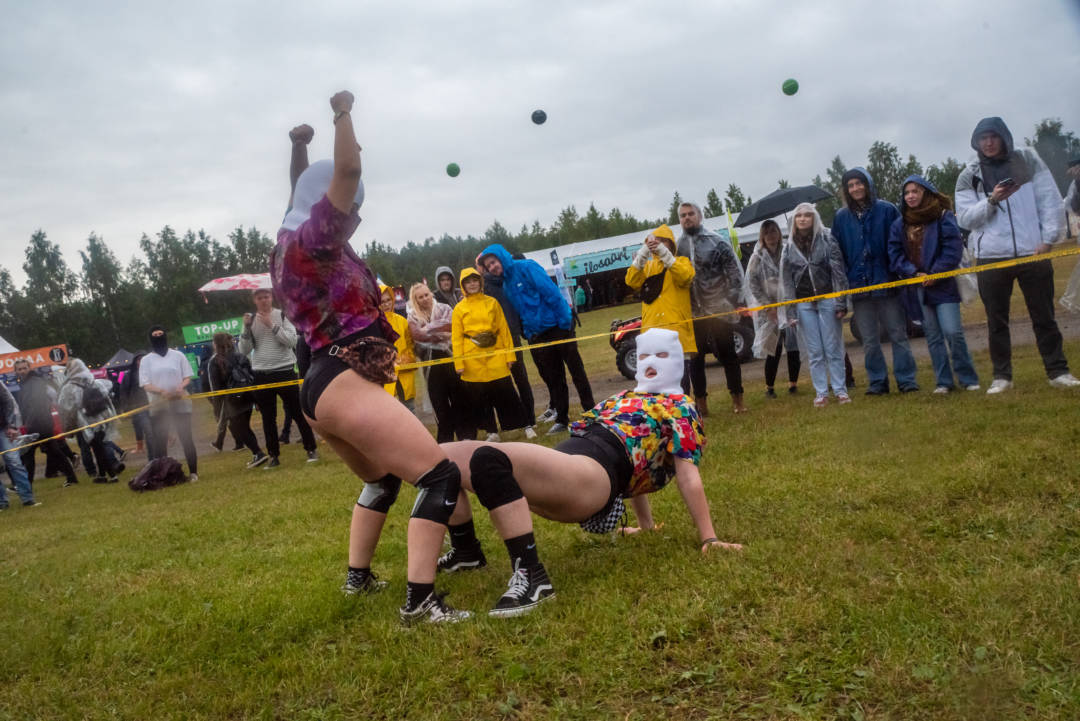 On Ilosaarirockin ensimmäinen päivä. Keltainen huomionauha muodostaa Tähtiteltan läheiselle nurmialueelle kolmion, jossa tapahtuu pian jotakin huomiota herättävää. Ihmiset jäävät pienestä sateesta huolimatta katsomaan – eikä ihme, sillä joukossa parveilee kaksi kiinnostavan näköistä huppupäistä naista esiintymisasuissaan.